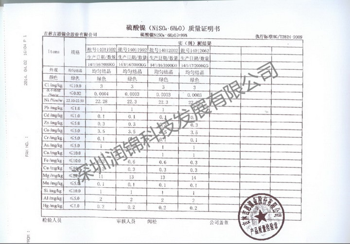 作 用:吉恩硫酸鎳主要用于高端電鍍,電子電鍍,化學鍍,高端鋰電池三元材料,高端鎳氫電池材料及高純試劑等用途。